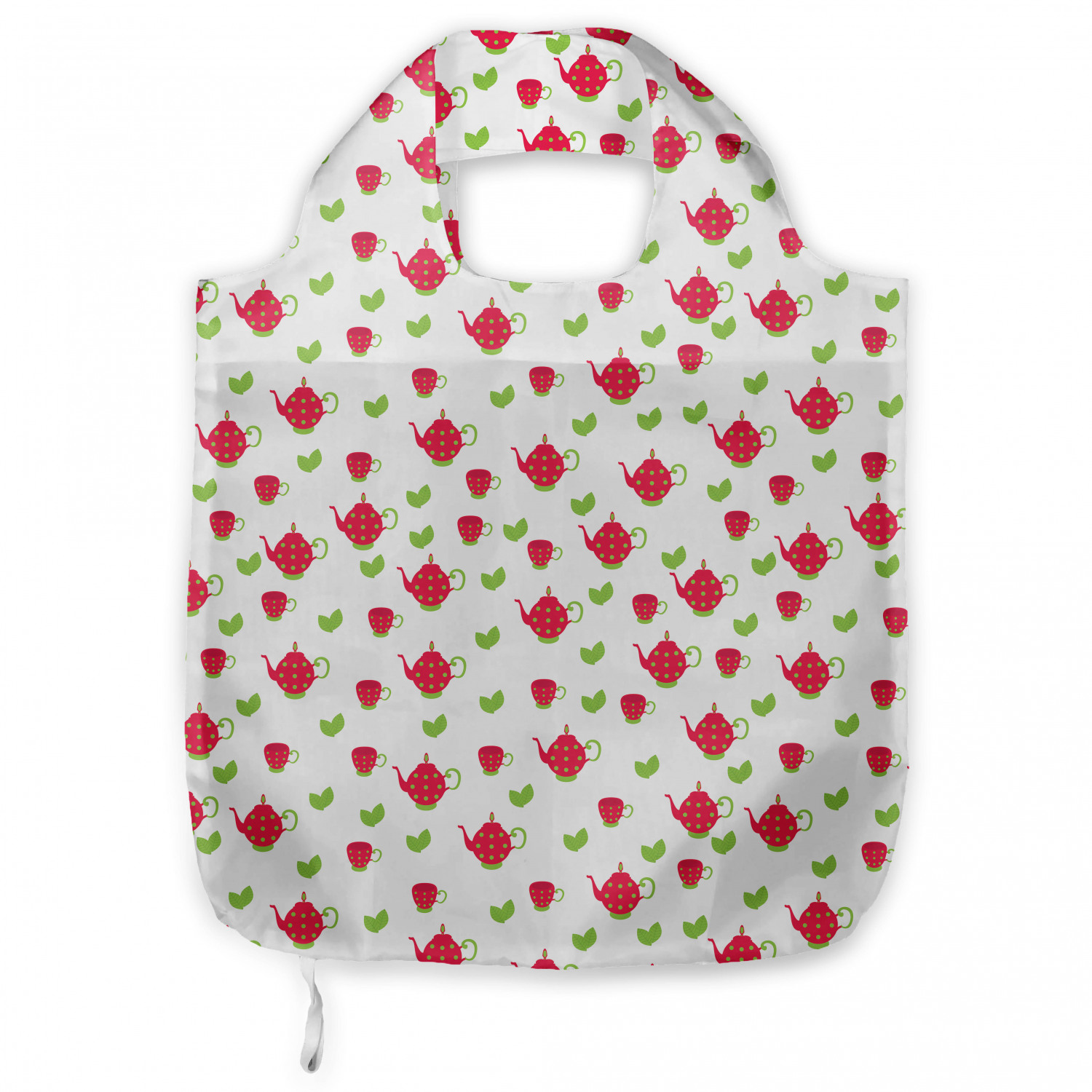 Tea Party Fabric Shopping Tote Teapots With Polka Dots And Leaves Tea Time Image Beverage British Design Portable And Foldable Bag To Keep In Pocket Bag Purse Car Dark Coral Green